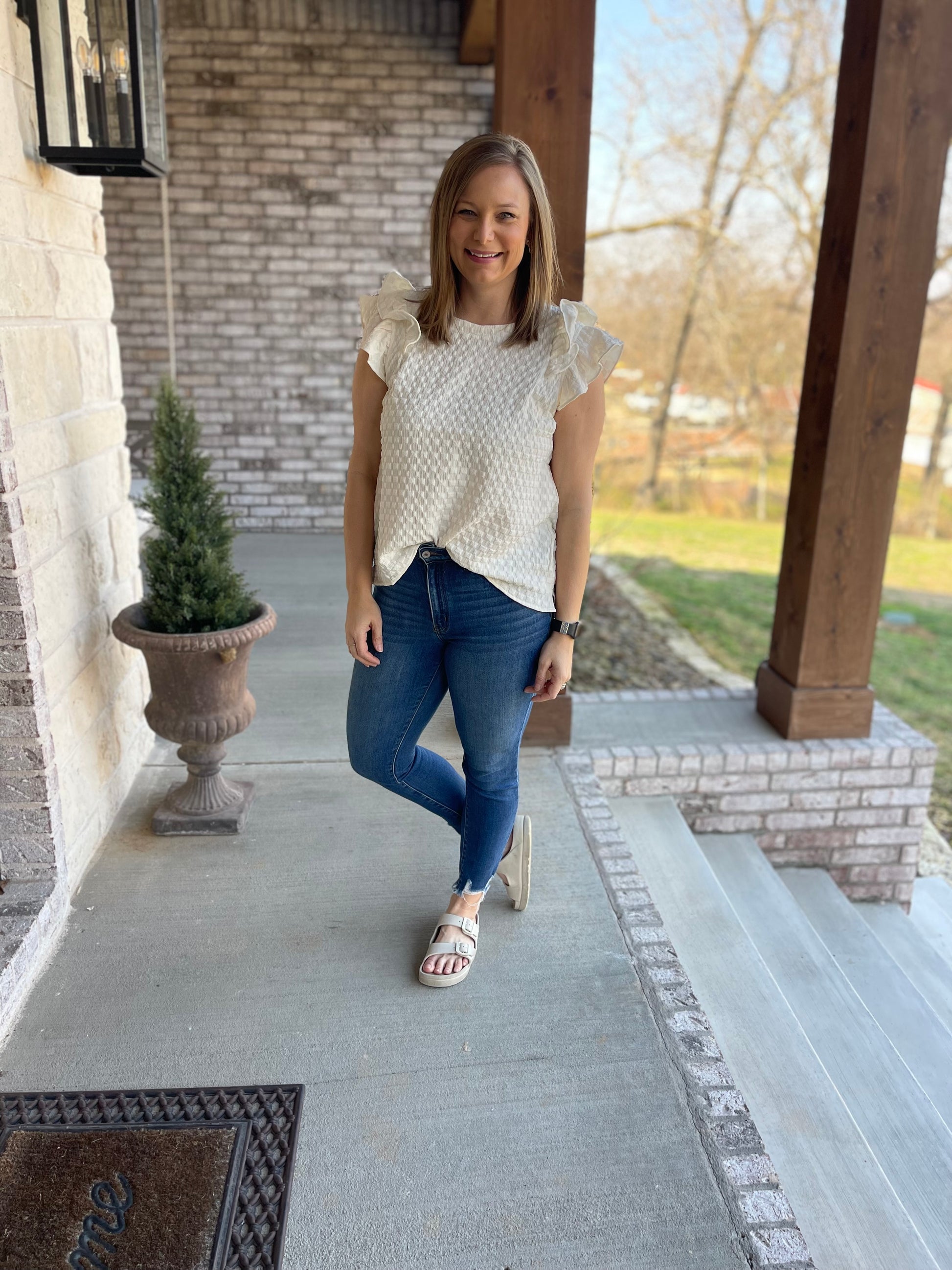 This textured flutter top brings an elevated look to a classic pair of jeans!