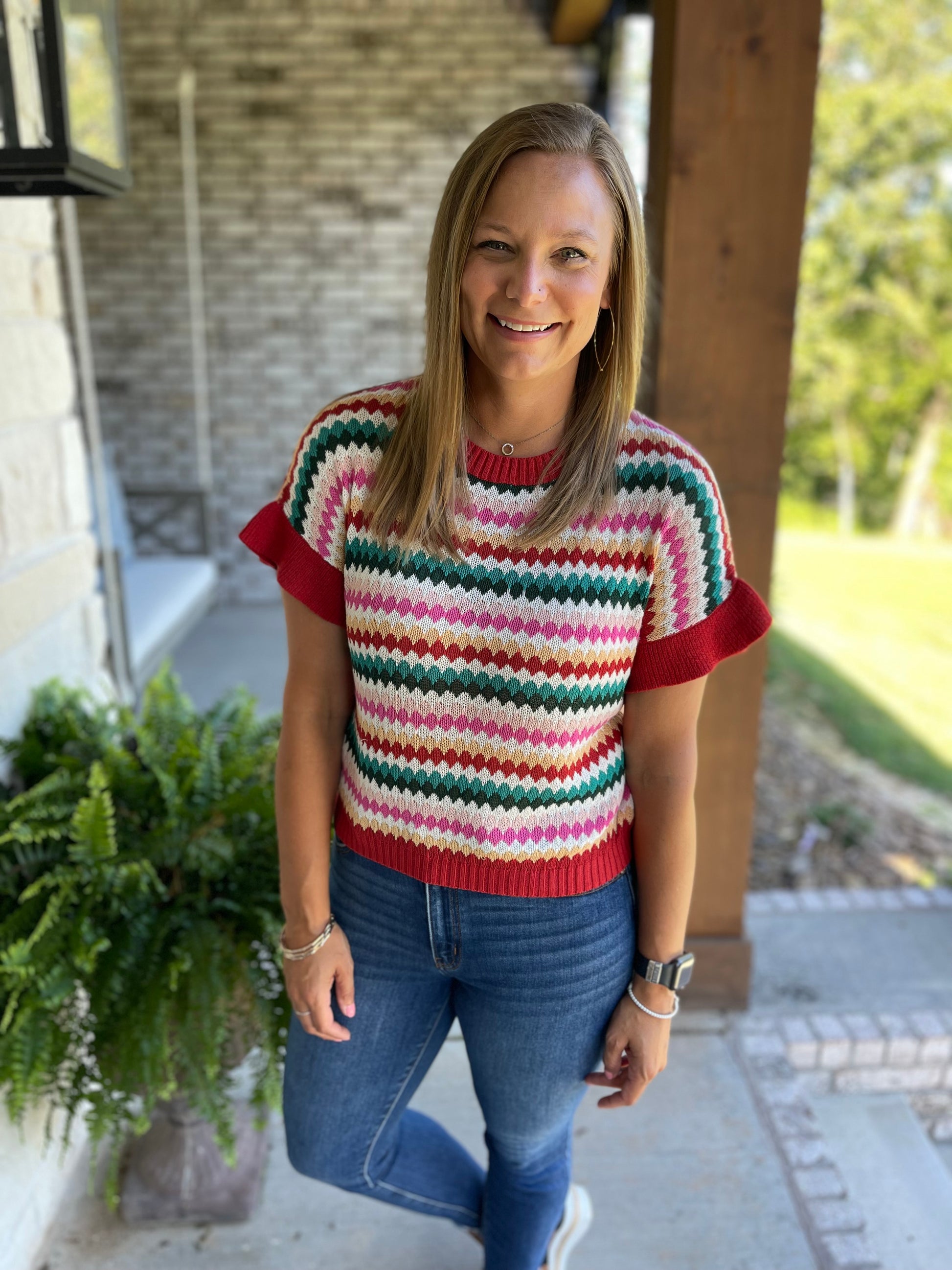 This sweater will get you ready for fall with beautiful color and texture. the sweater is a little shorter in length, has fun ruffles sleeves and a scoop neckline.