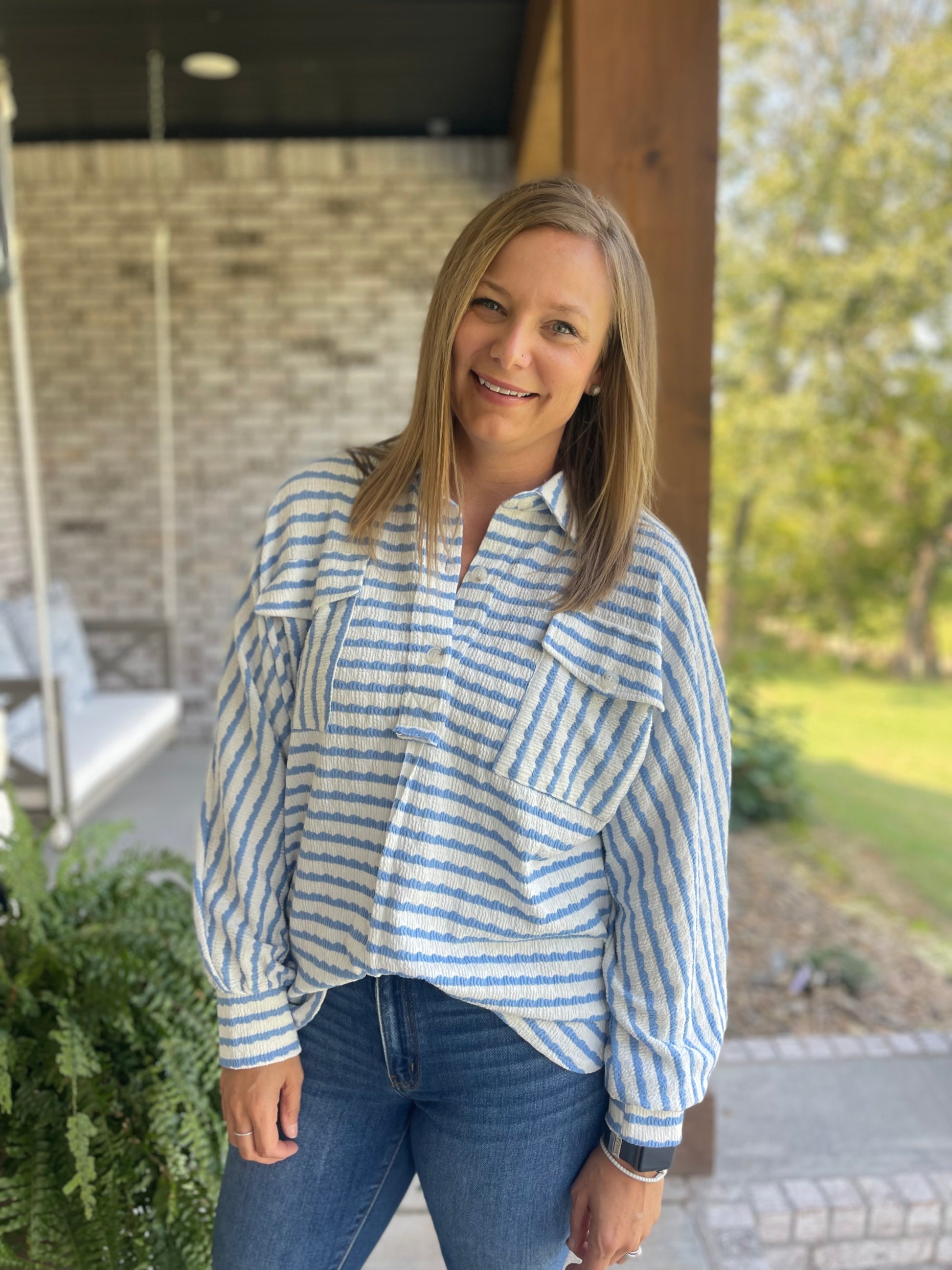 This oversized top is lightweight and has a fun texture. the button pockets on the front are fully functional!