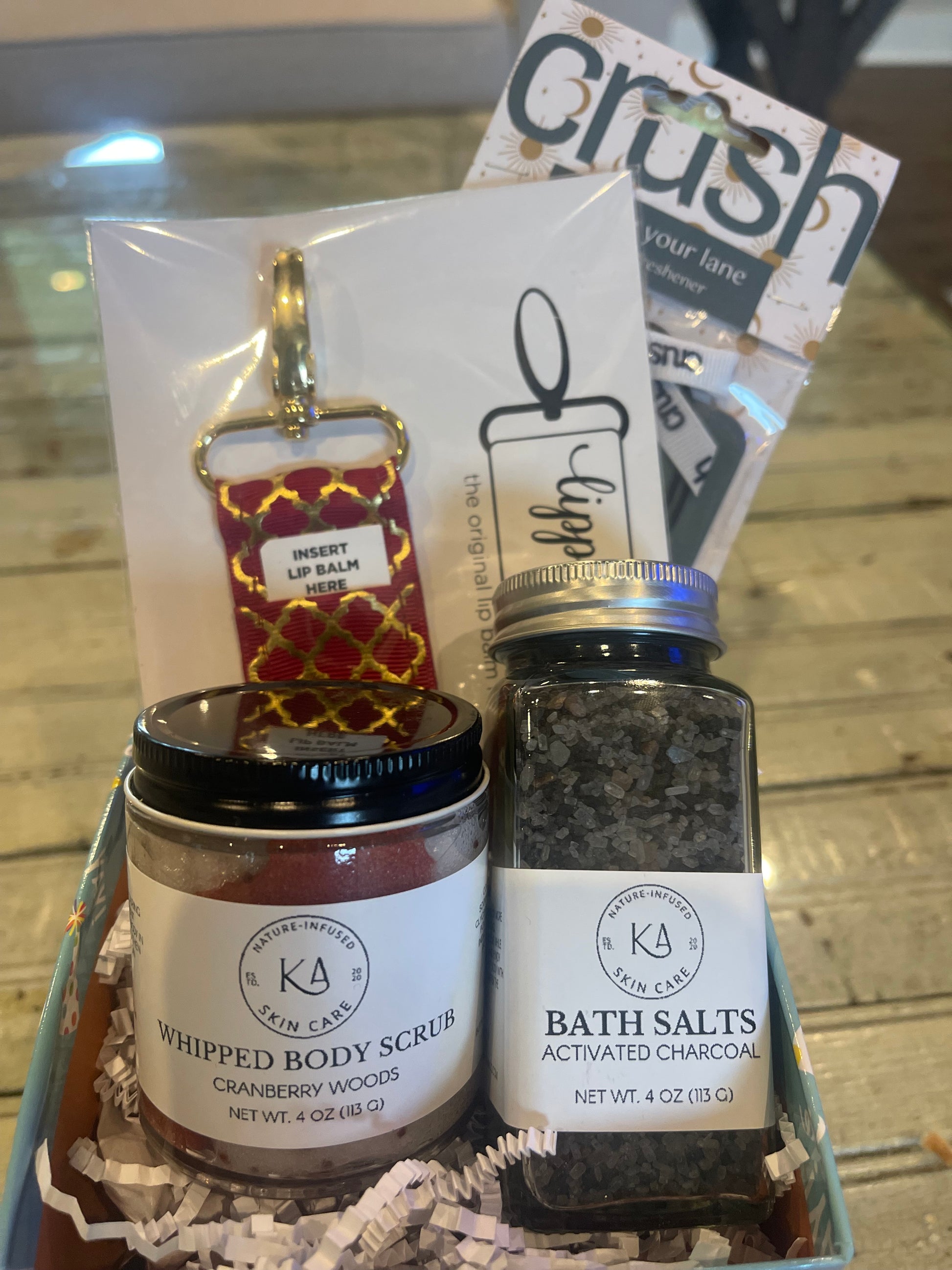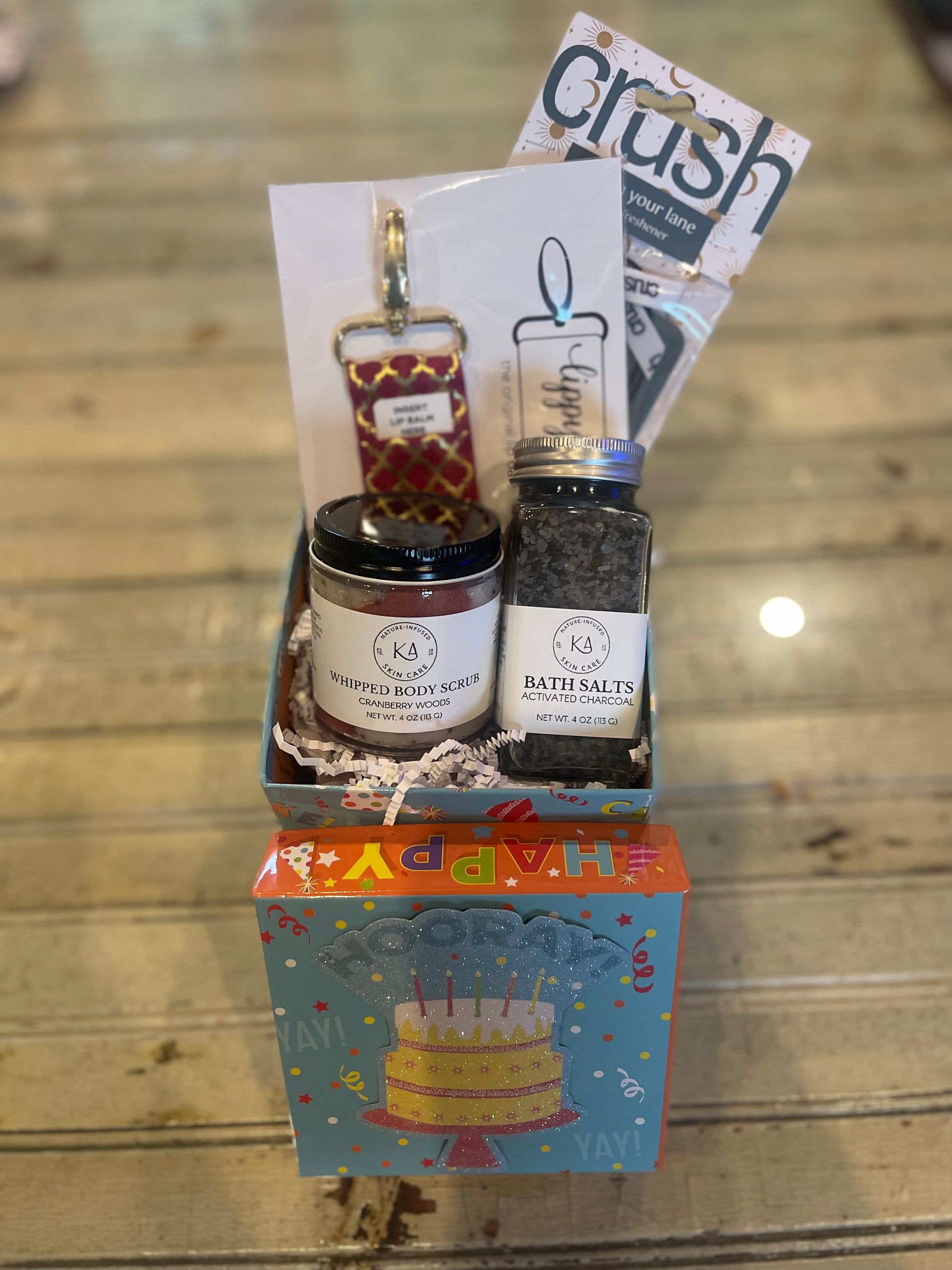 This box includes a car fresh, lippy clippy for lip balms, whipped body scrub, and a bath salt all wrapped up in a happy birthday box!