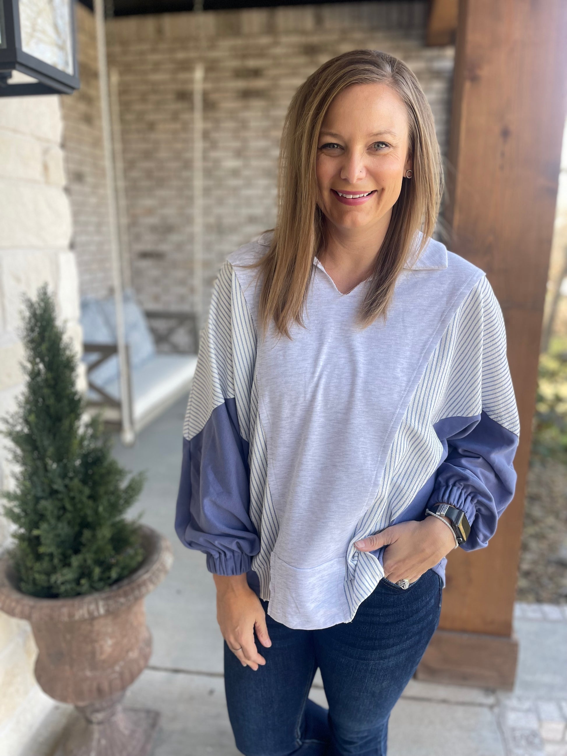 This slightly oversized dolman top with collar has a fun color block style that will also bring comfort all day long!