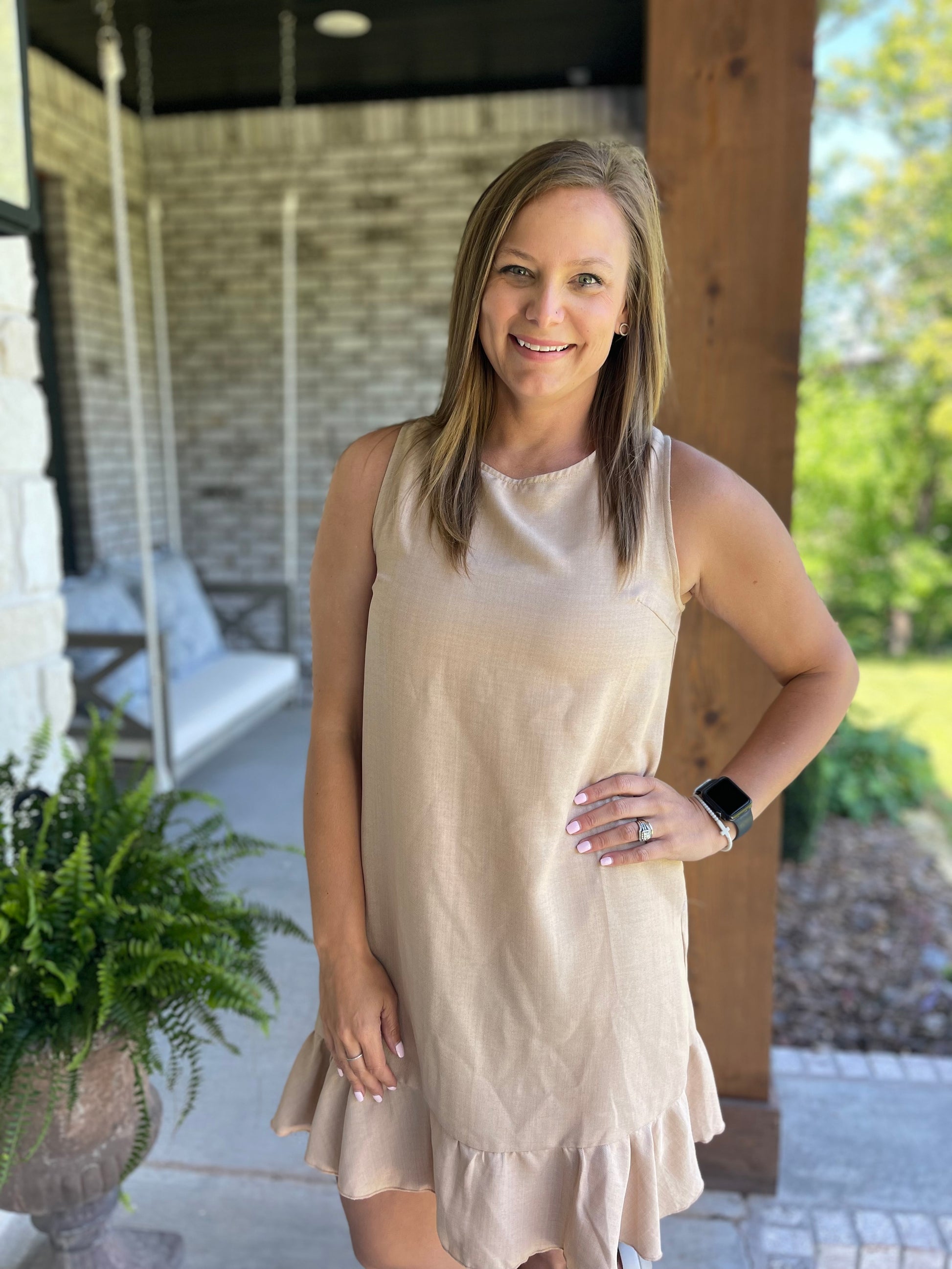 This tank dress is a classic A line dress with a twist! The hem has a fun ruffle, and the neck has a beautiful tie in the back!