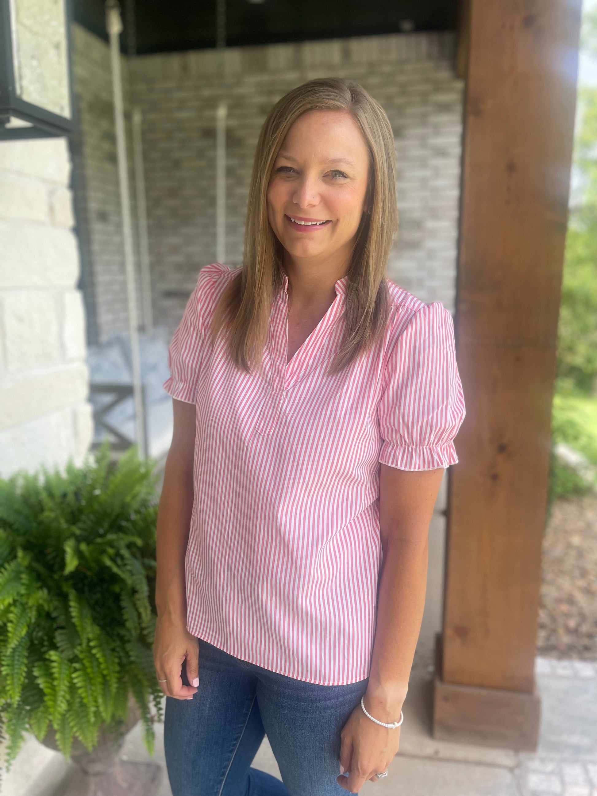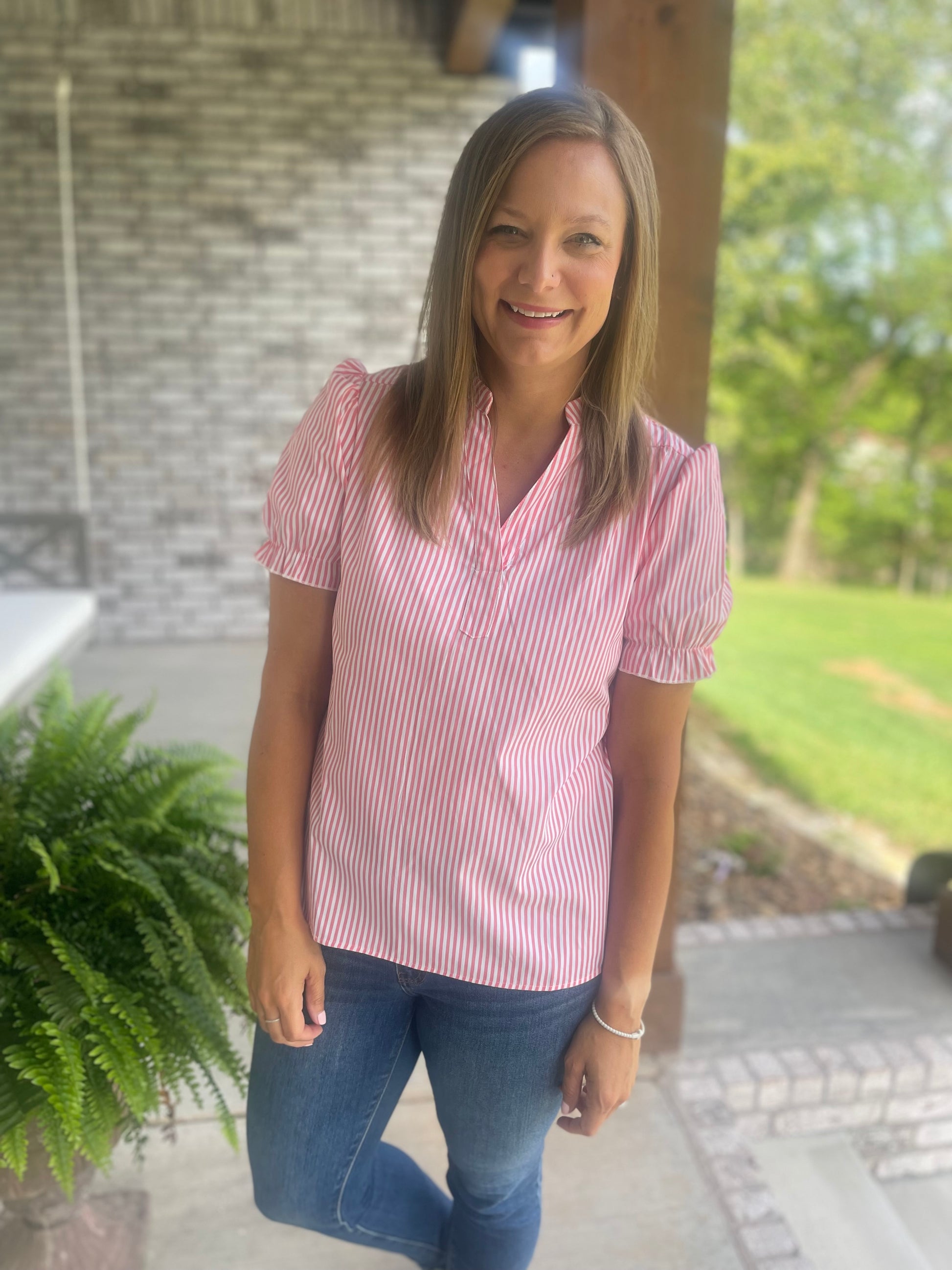 Give me all the vertical stripe tops! The Miley has a beautiful bright coral color and fun puff sleeves!