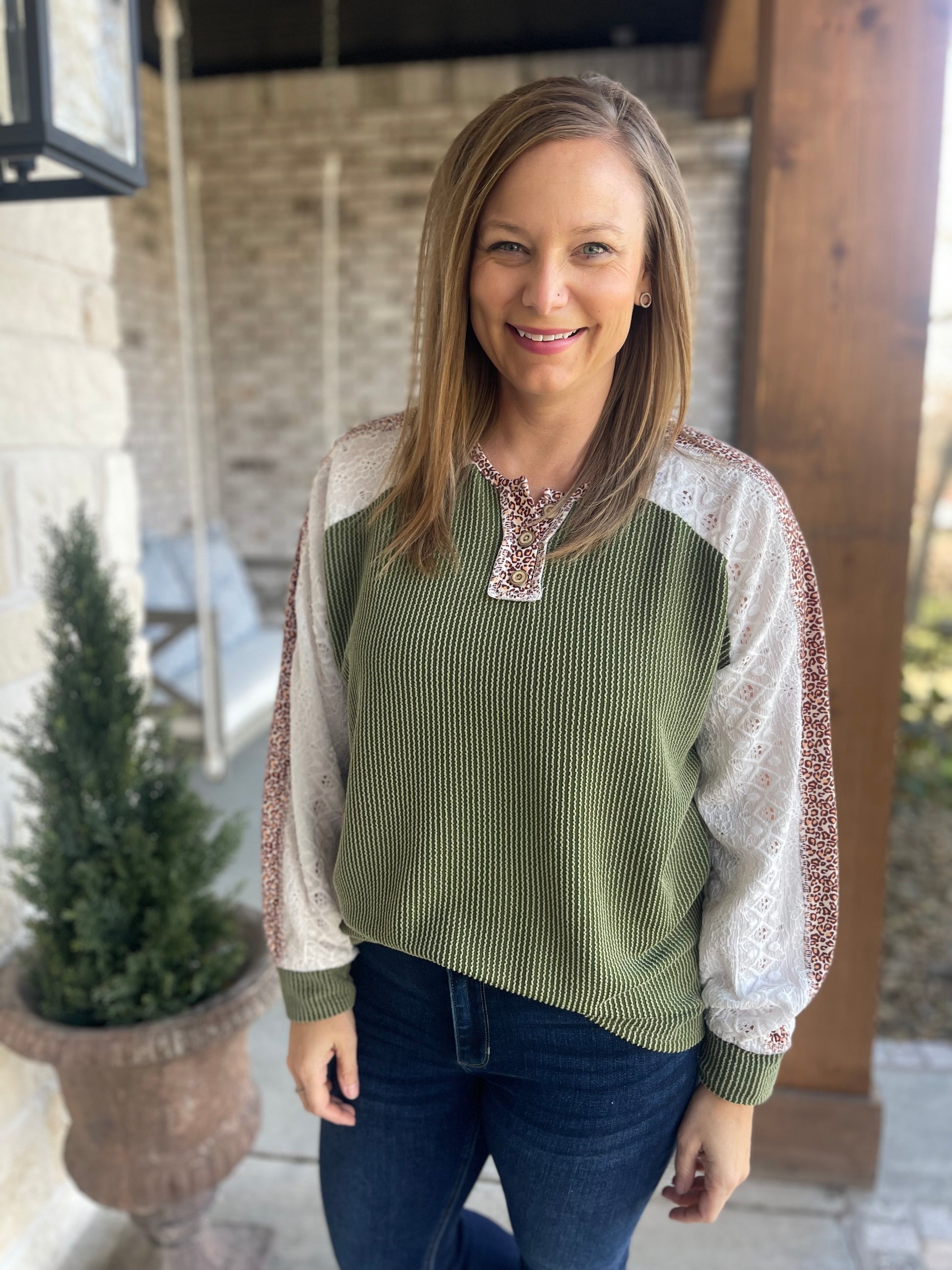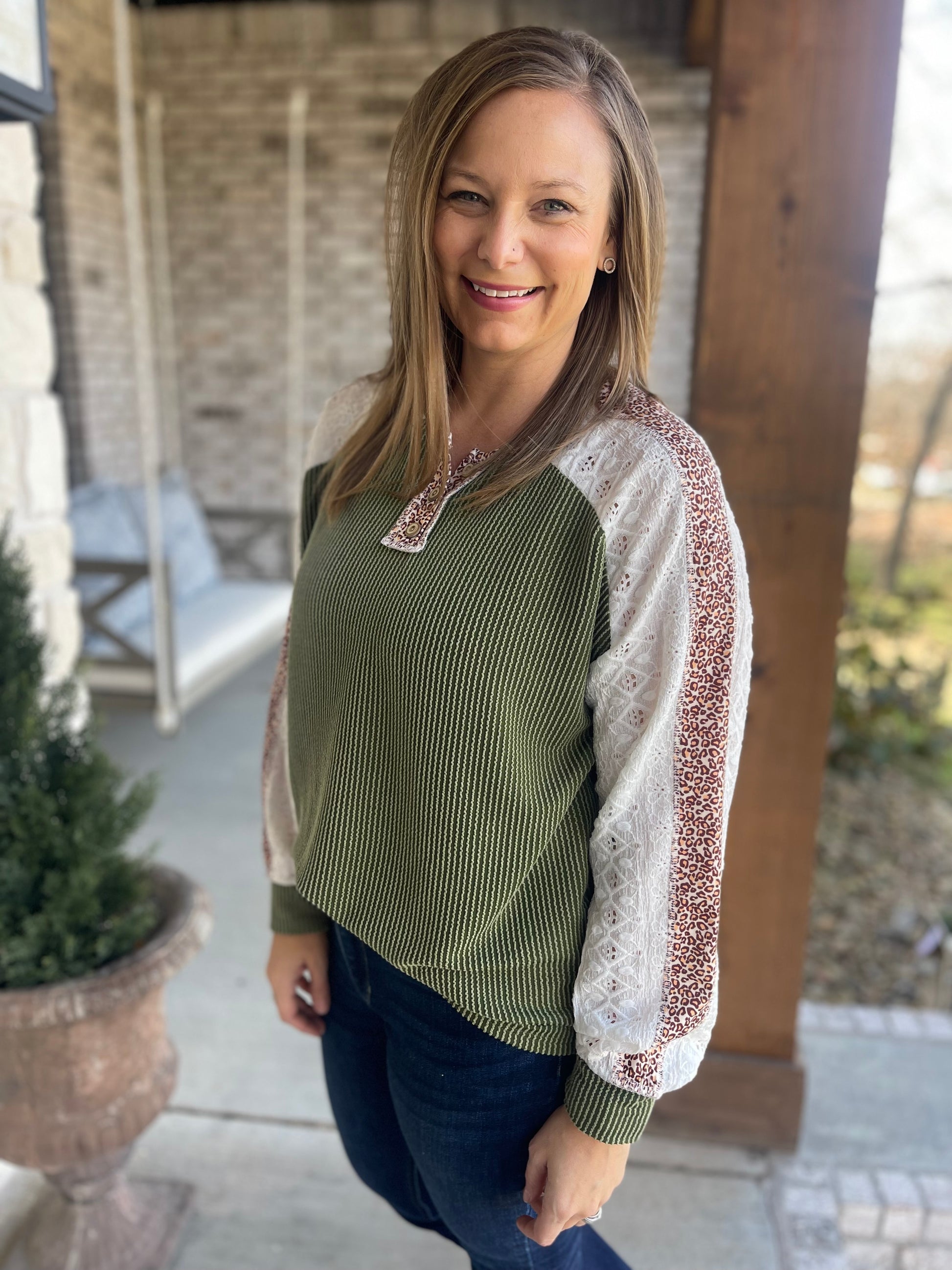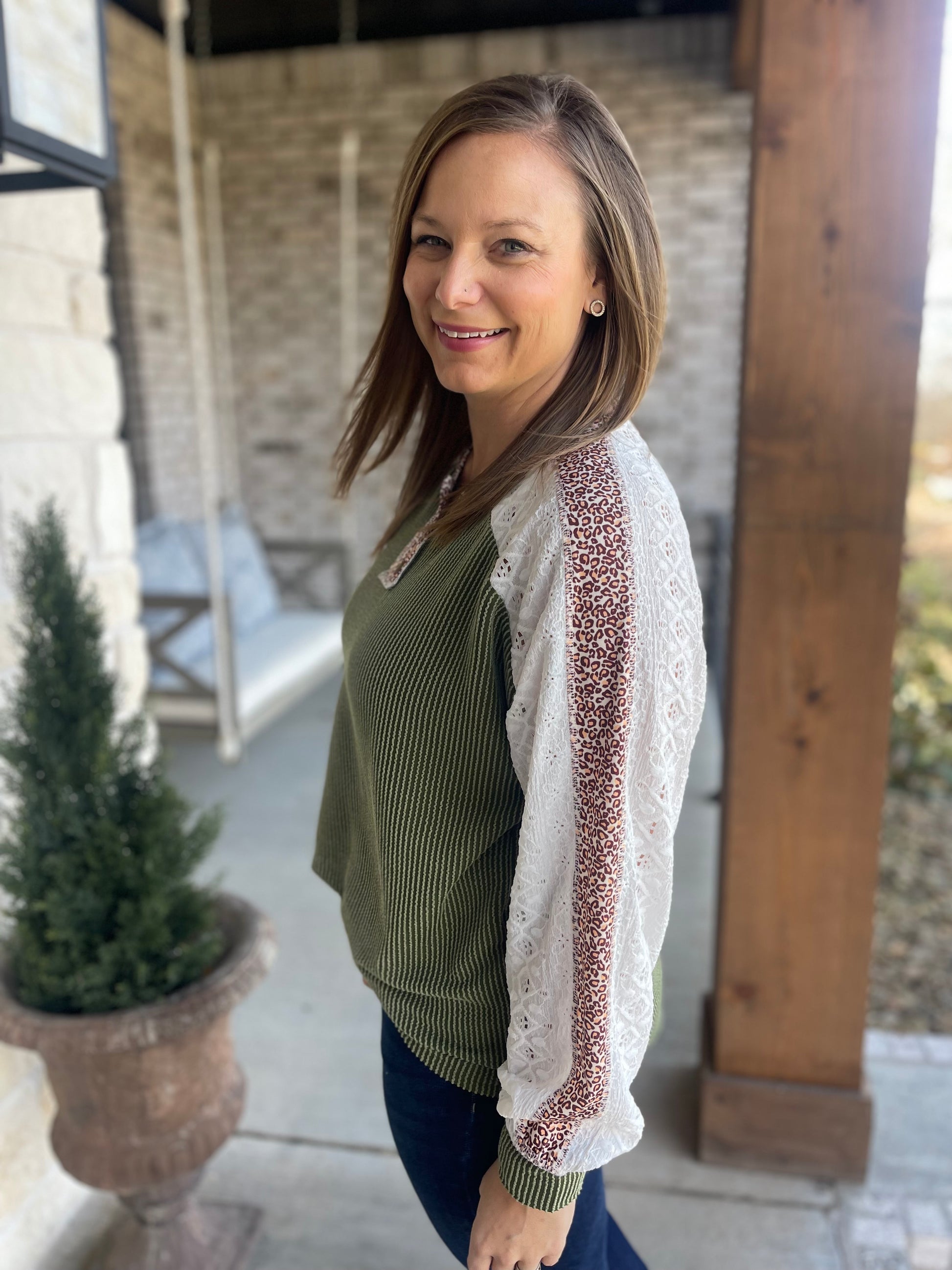 The Gracie top has so much detail from the wooden buttons, the raised rib texture, the leopard trim and the beautiful detailed sleeves!