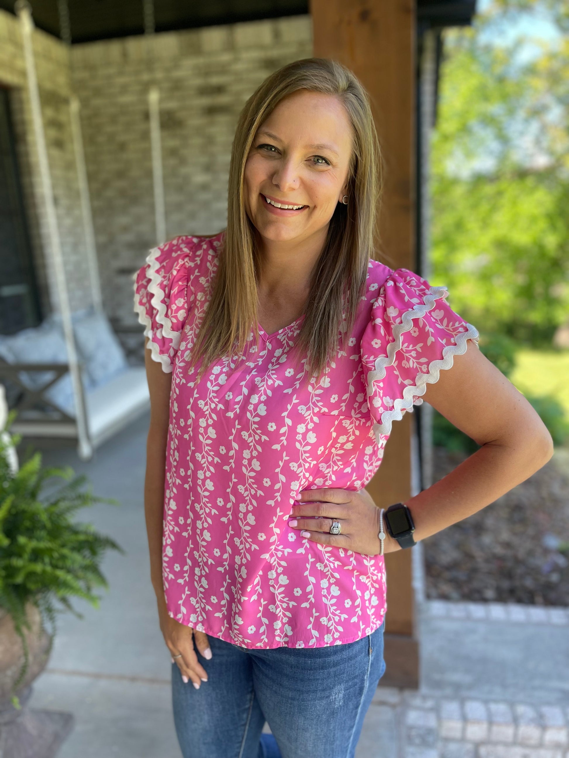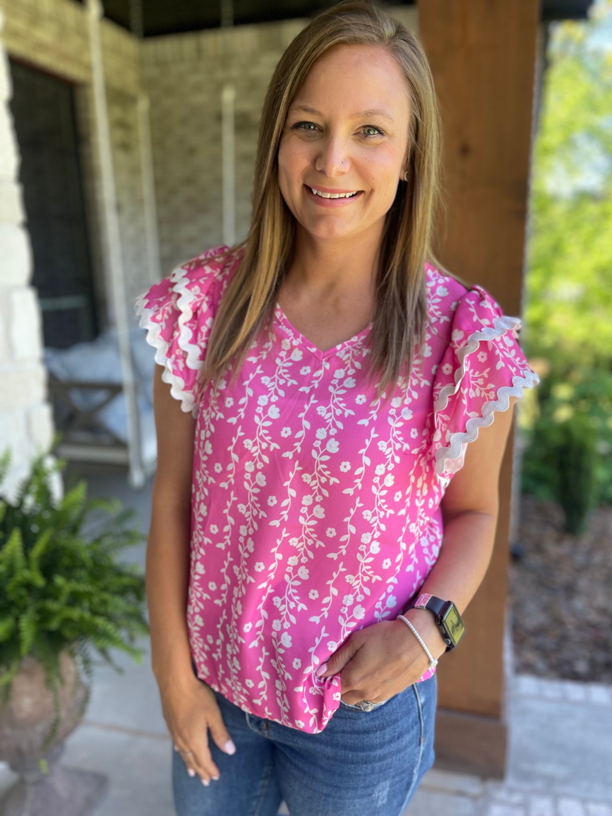 this top has a beautiful flutter sleeve with ric rac accents that make it unique.