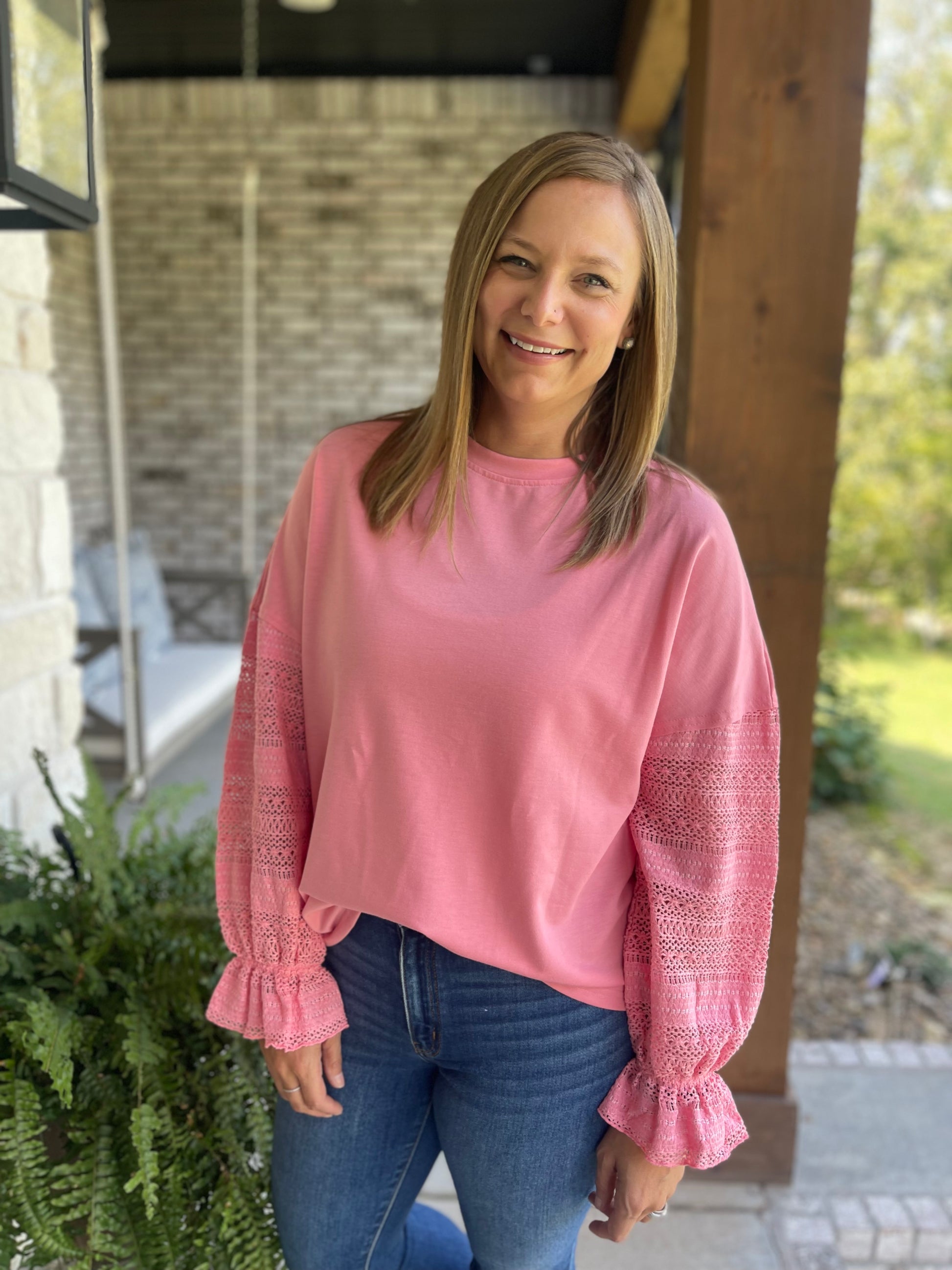 This top has a classic look with beautiful lace sleeves for just the perfect feminine look.