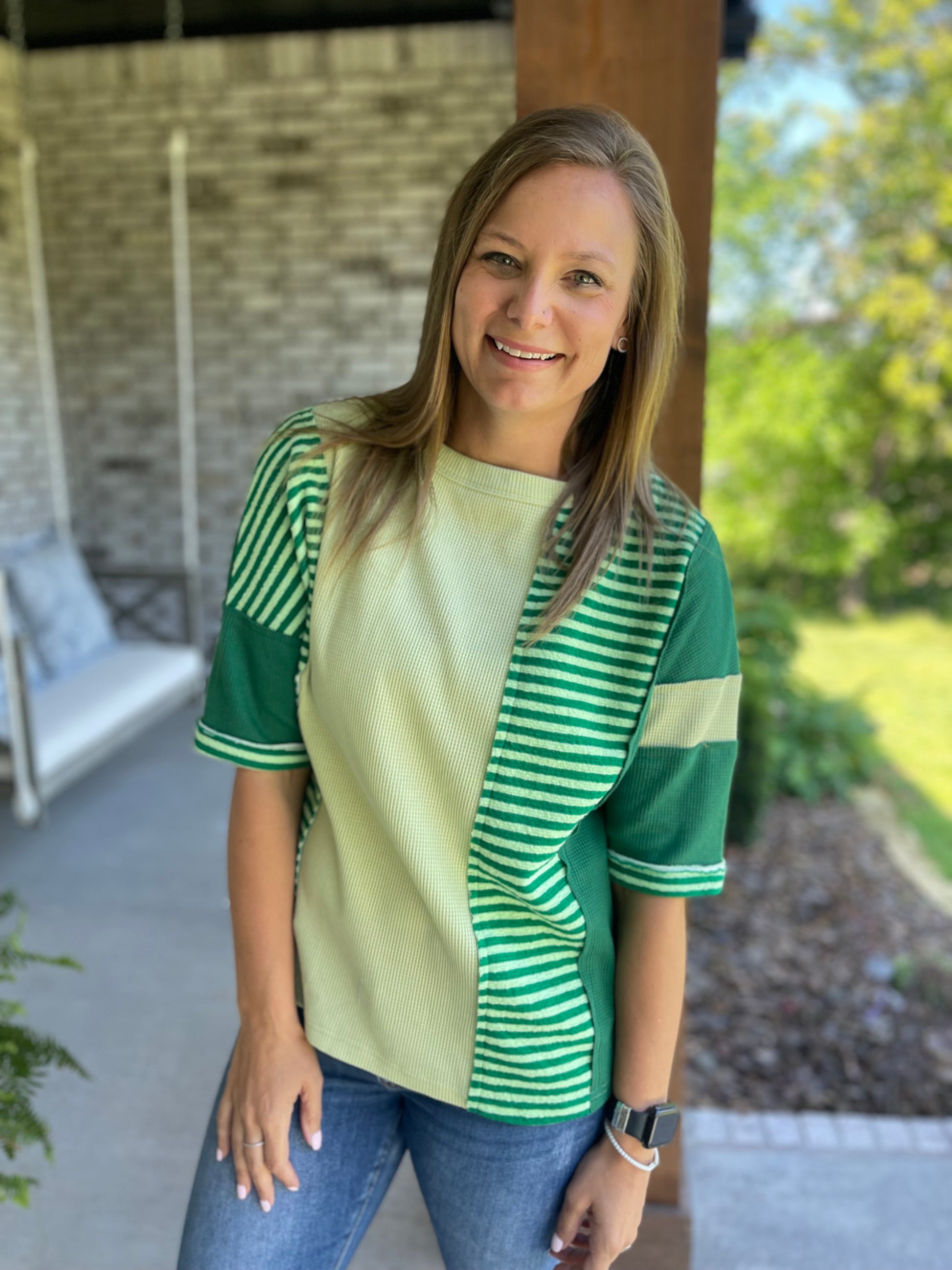 the soft waffle material tee is comfortable and cute! we are loving the longer sleeve length and all the mixed patterns!