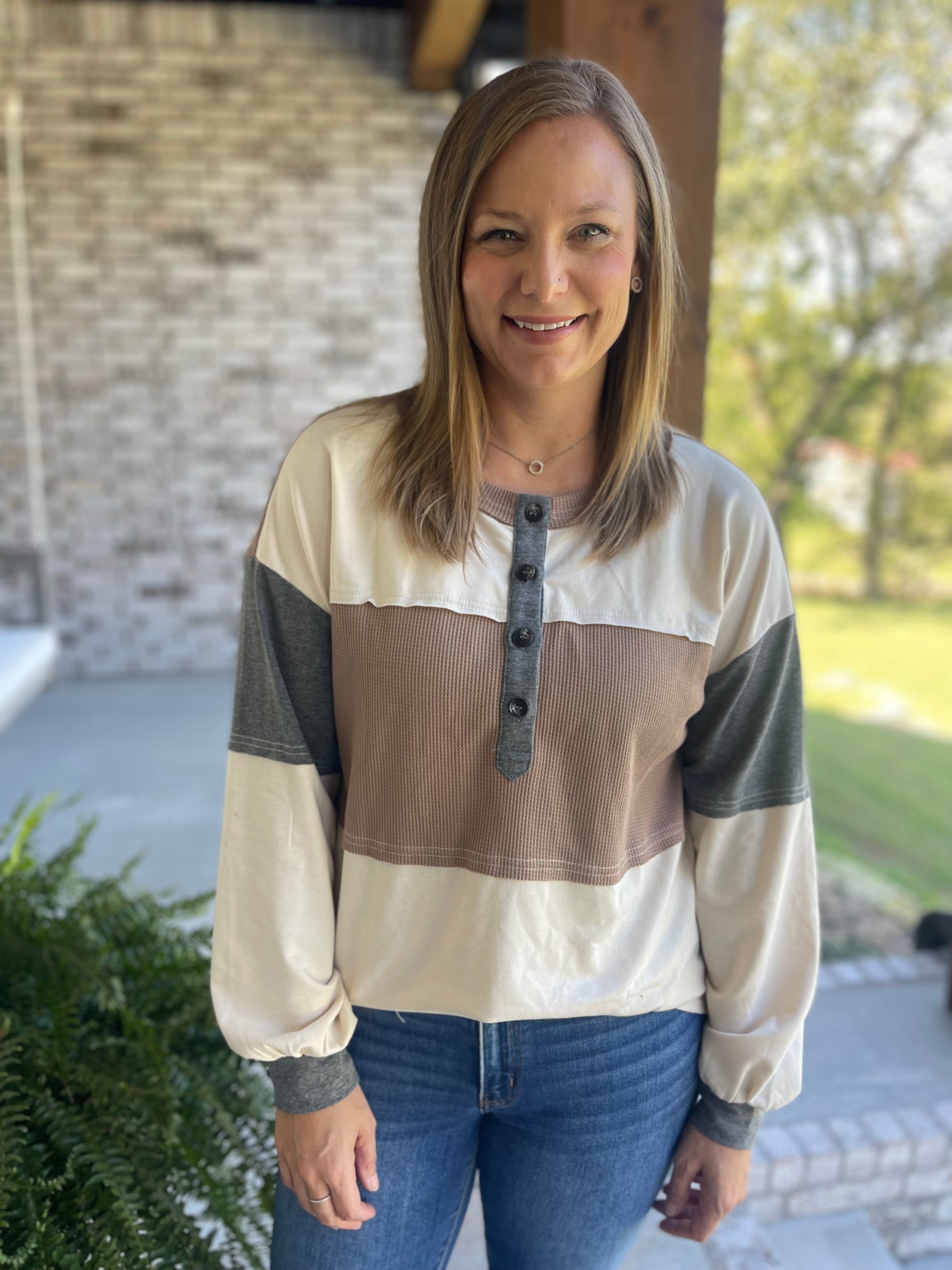 This neutral henley gives a classic look with a waffle patchwork that that will add texture and style.
